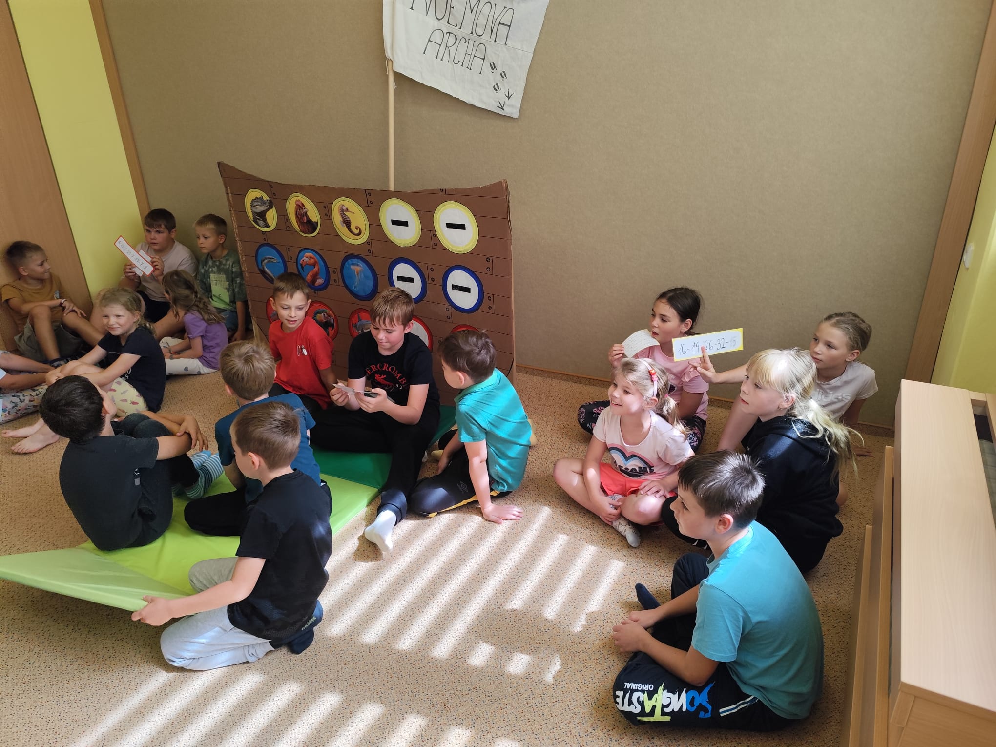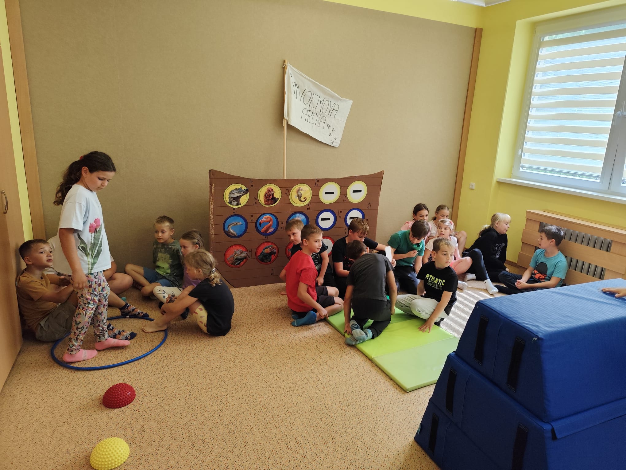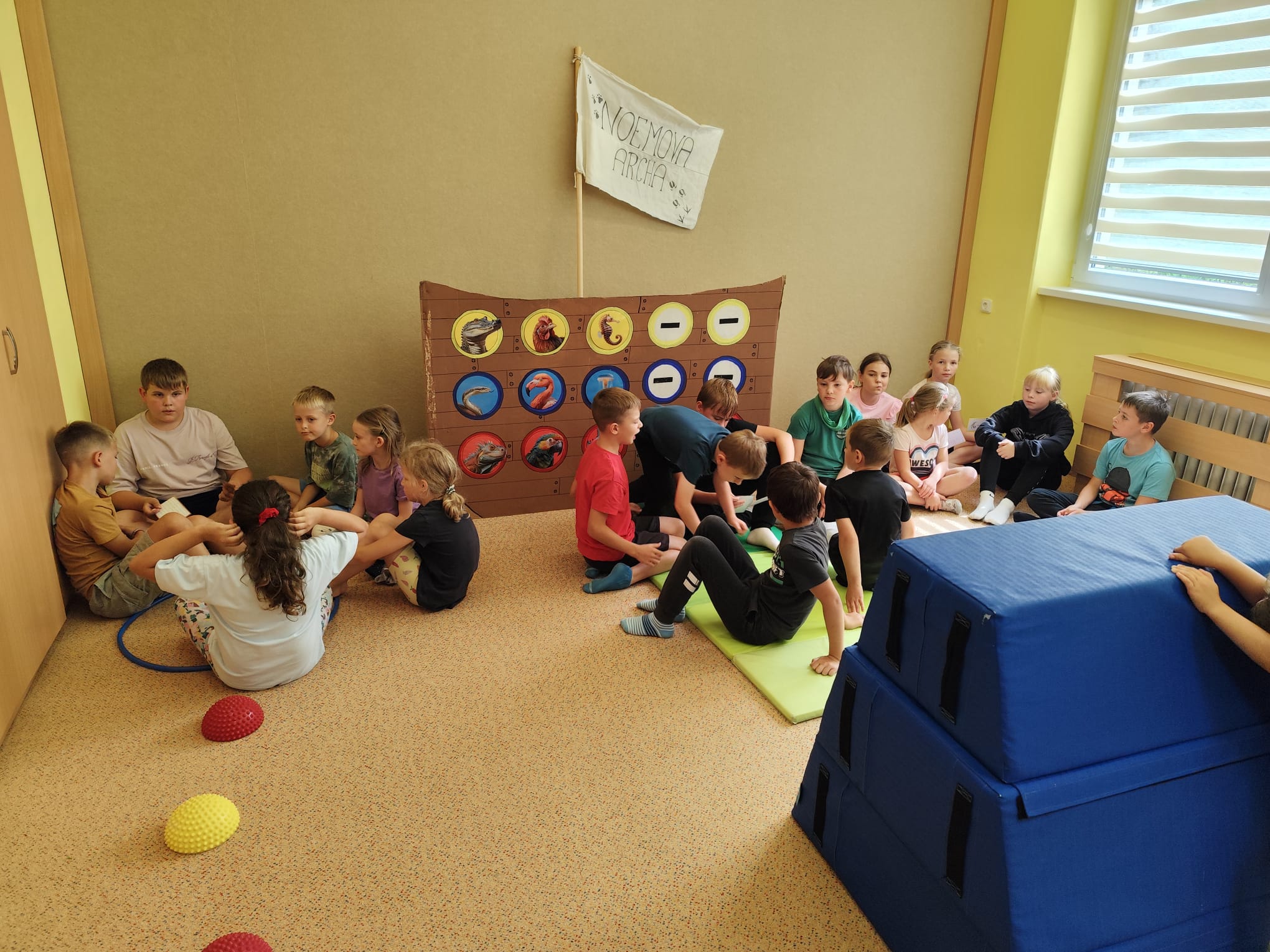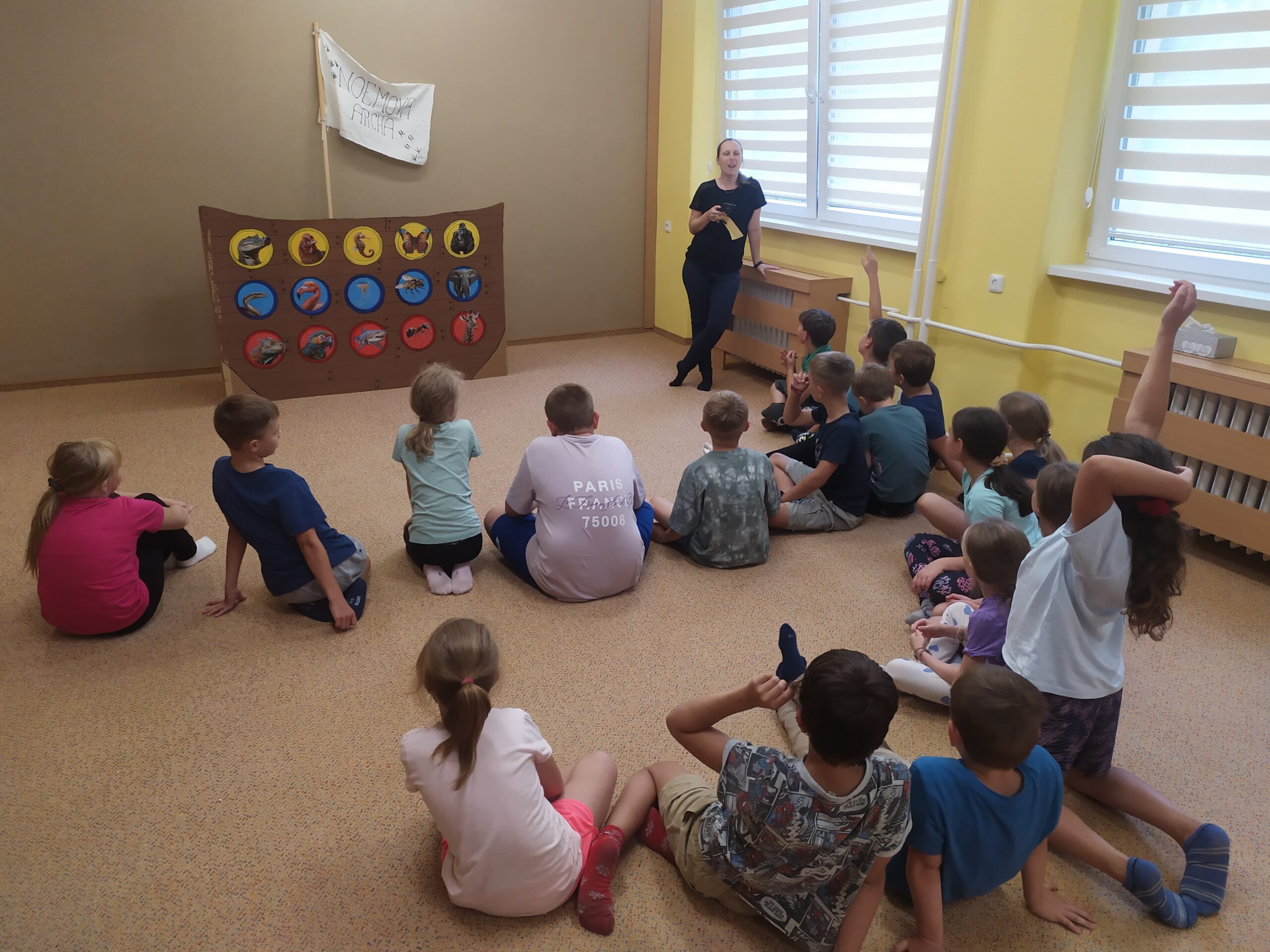 Hned první den se děti vzájemně seznámily, rozdělily do tří týmů – červeného, modrého a žlutého – a pustily se do her, které rozvíjely spolupráci i rychlost. Společně také začaly plnit hlavní úkol tábora: zachránit zvířata před blížící se potopou a nalodit je na archu. Prvními zachráněnými byli krokodýl, zmije a leguán. Na závěr dne si děti vyrobily krásné lampičky z balónků, které jim osvítily čtvrteční společný táborový večer.