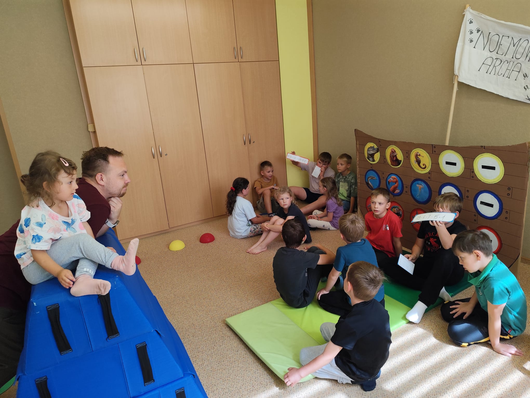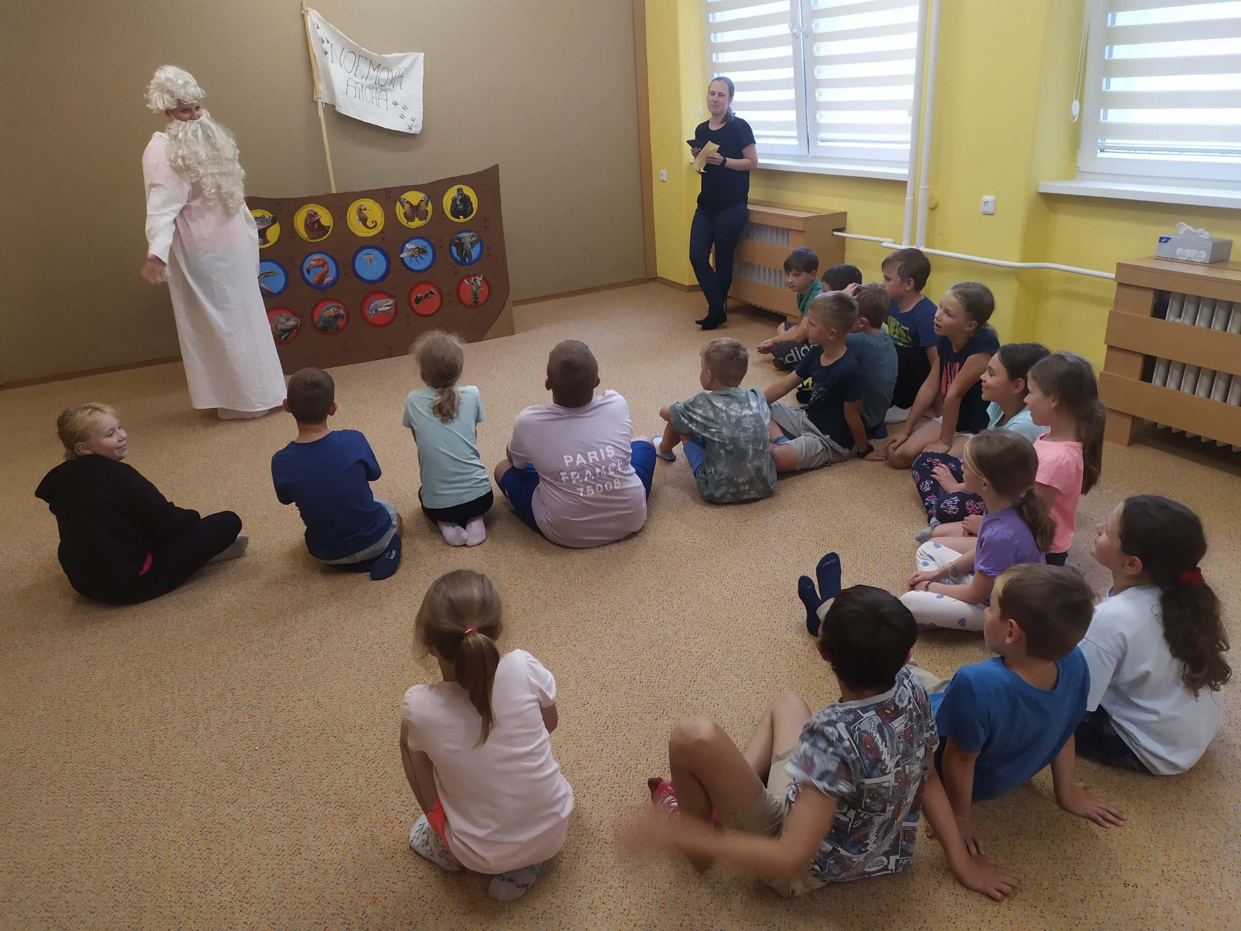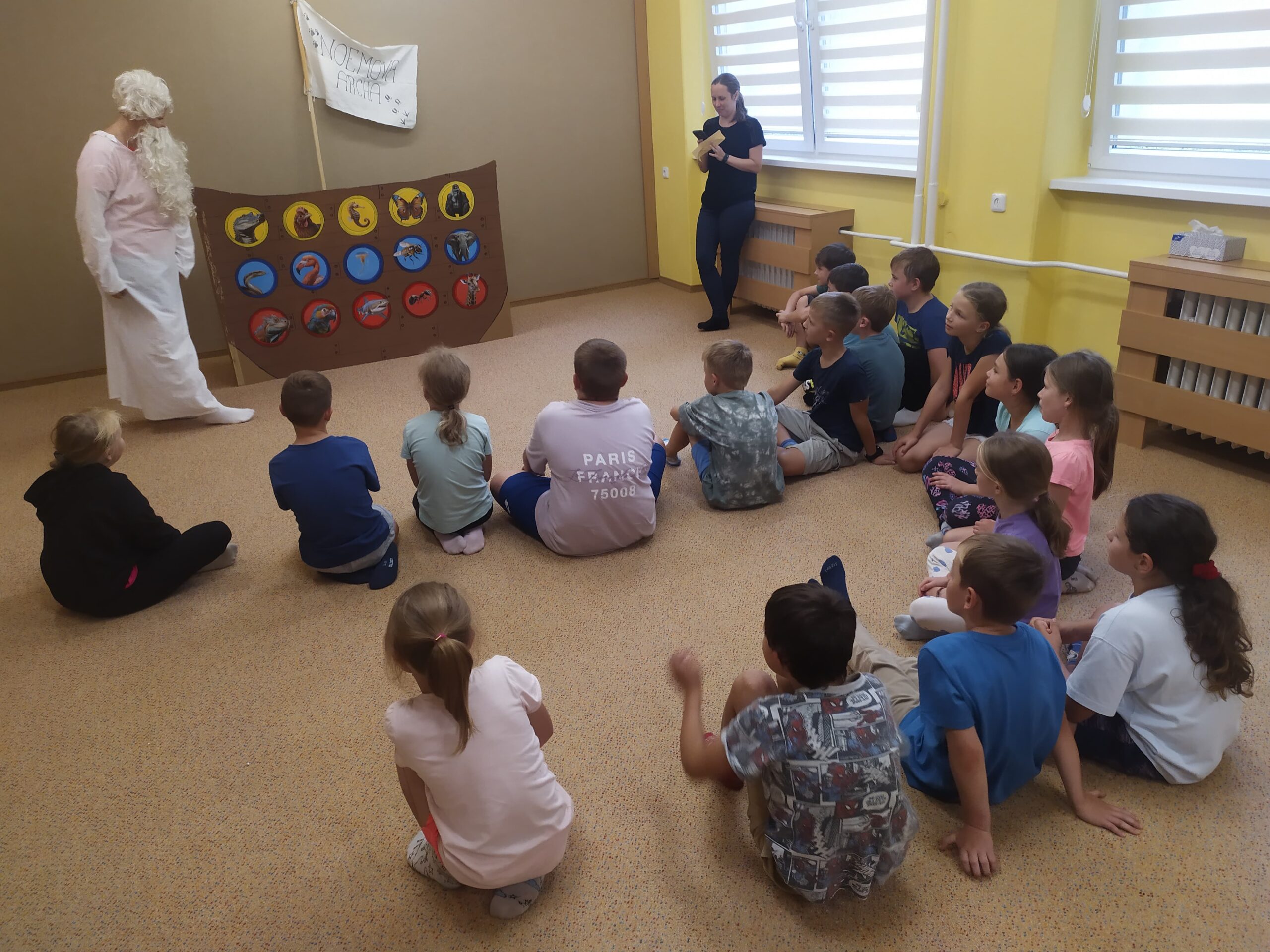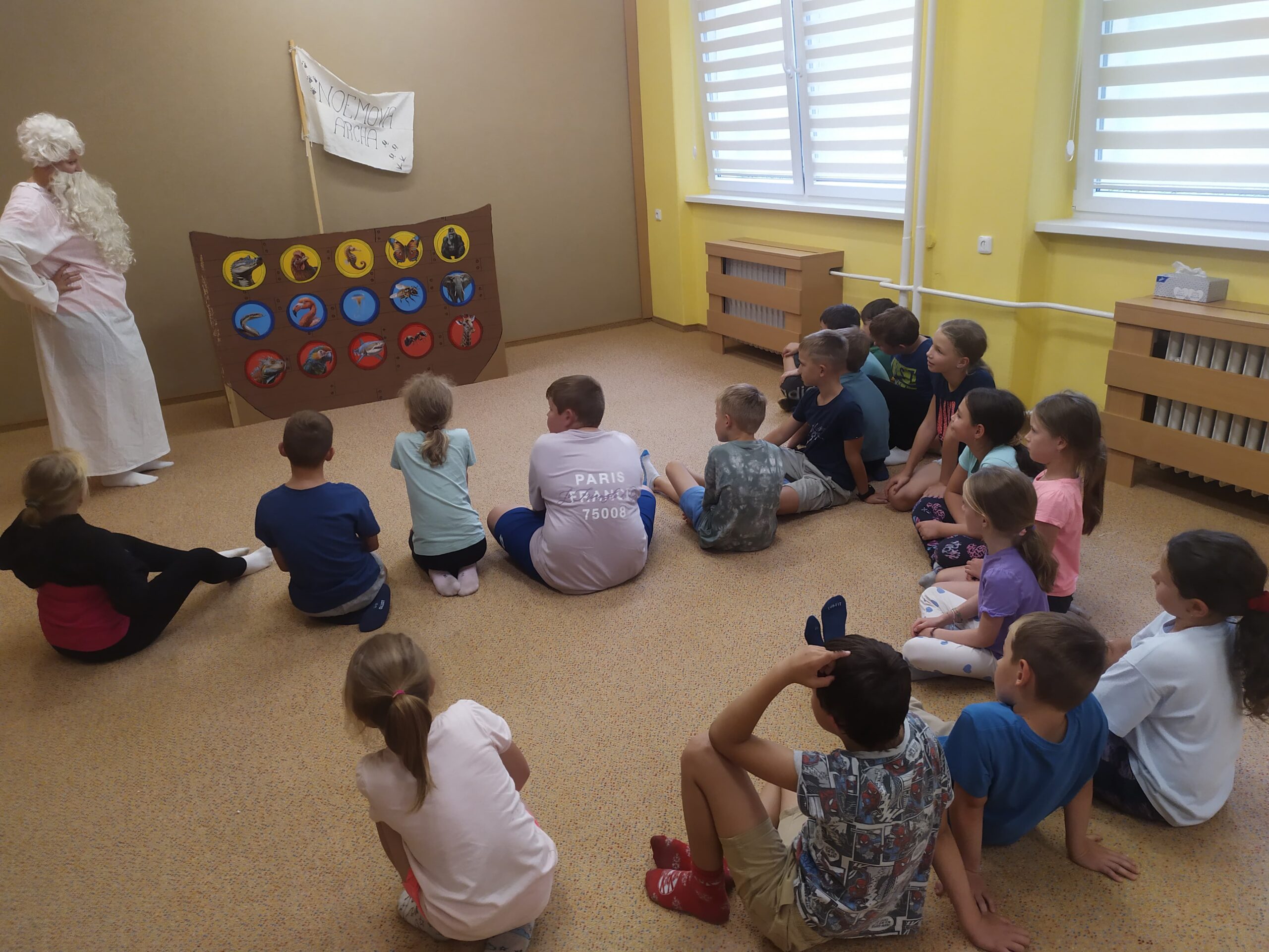 Hned první den se děti vzájemně seznámily, rozdělily do tří týmů – červeného, modrého a žlutého – a pustily se do her, které rozvíjely spolupráci i rychlost. Společně také začaly plnit hlavní úkol tábora: zachránit zvířata před blížící se potopou a nalodit je na archu. Prvními zachráněnými byli krokodýl, zmije a leguán. Na závěr dne si děti vyrobily krásné lampičky z balónků, které jim osvítily čtvrteční společný táborový večer.