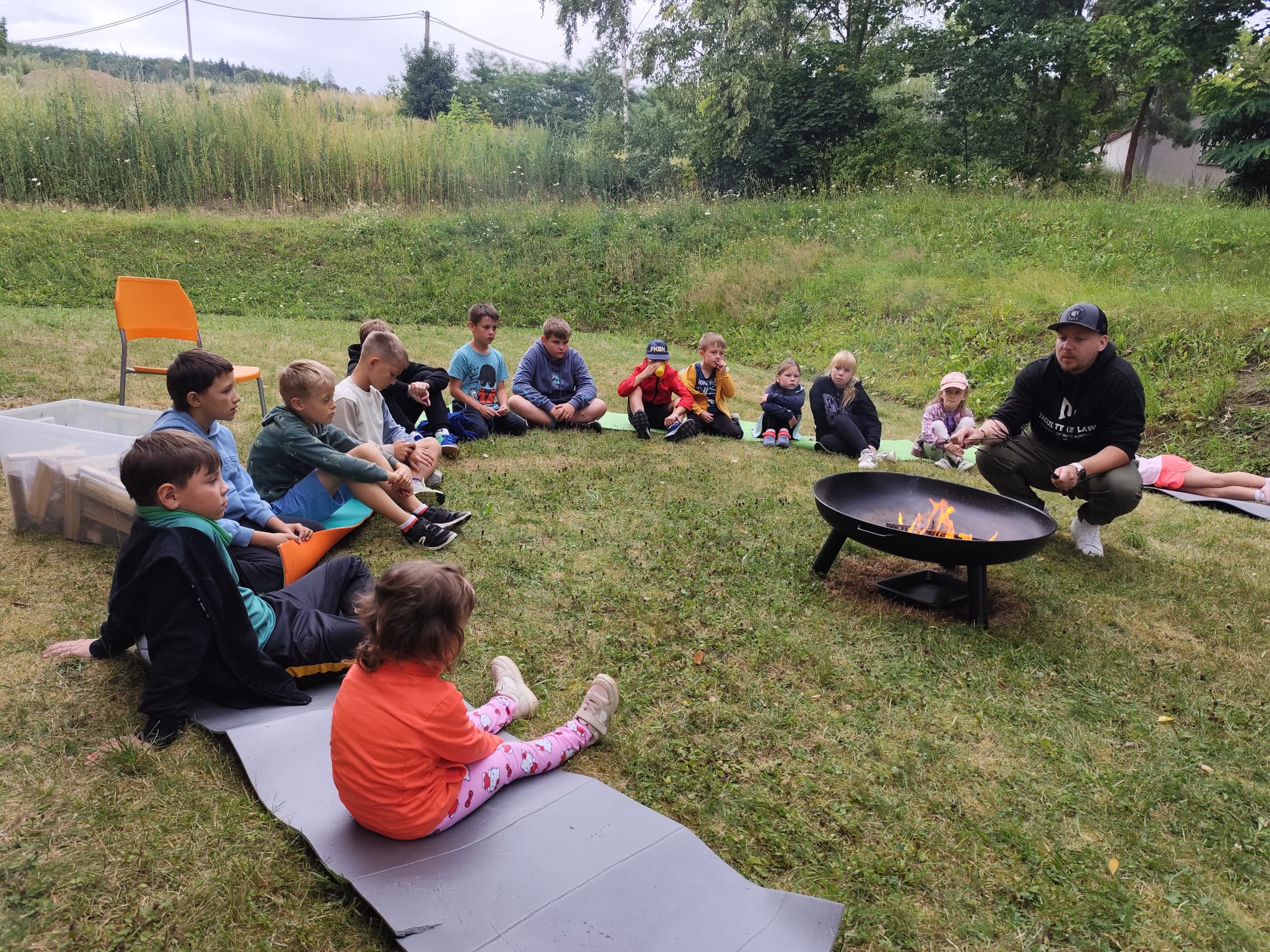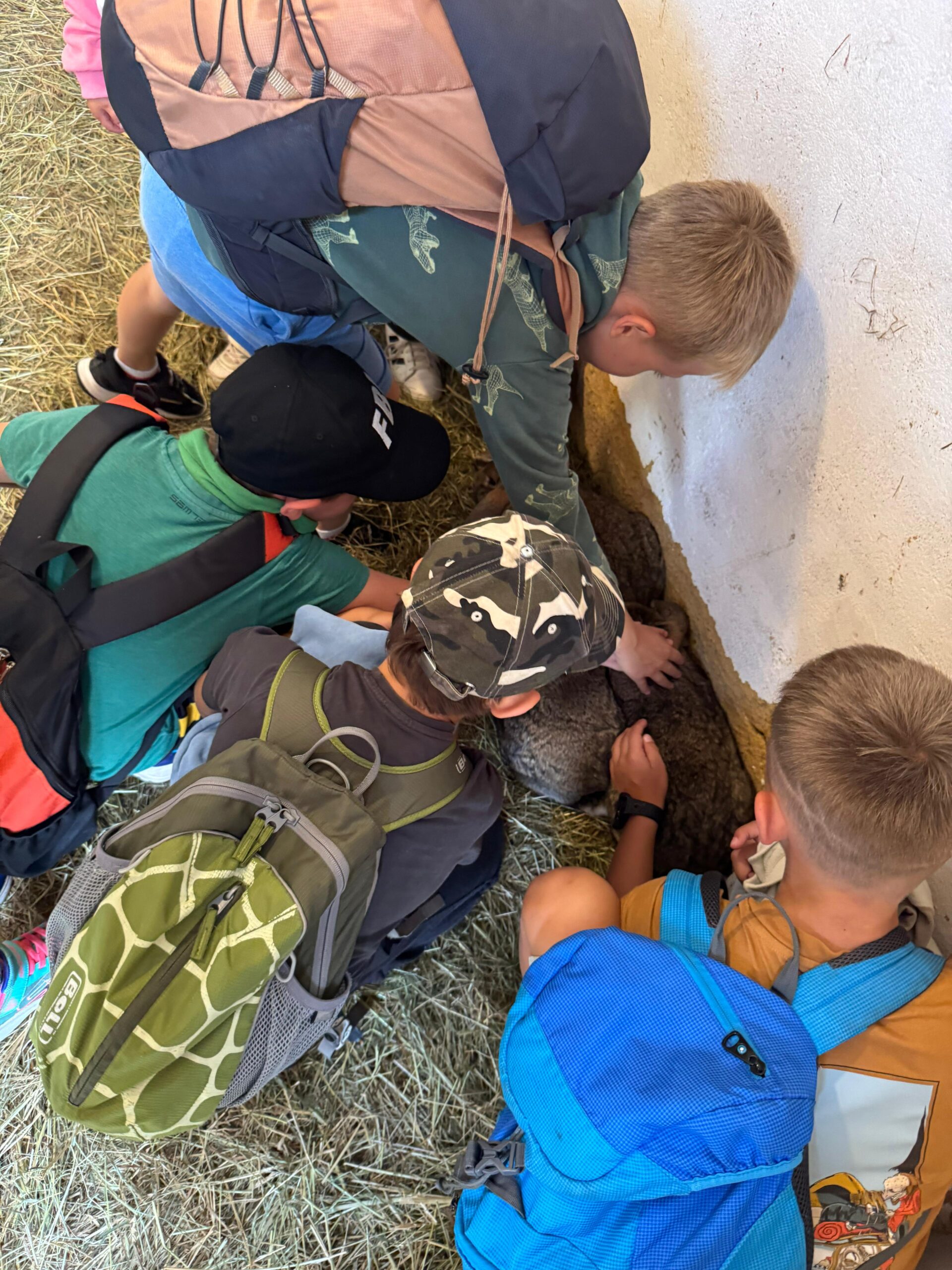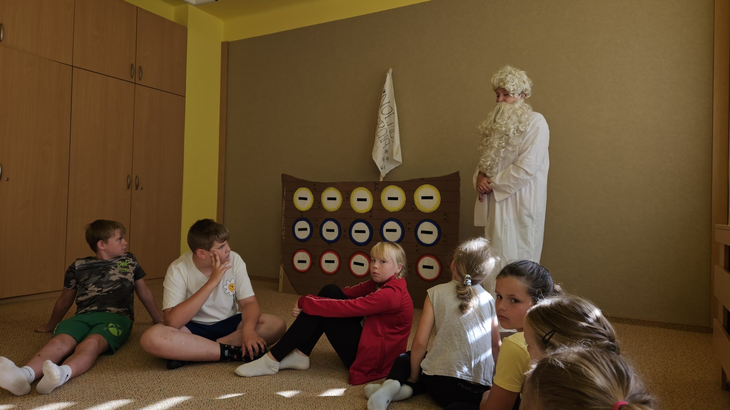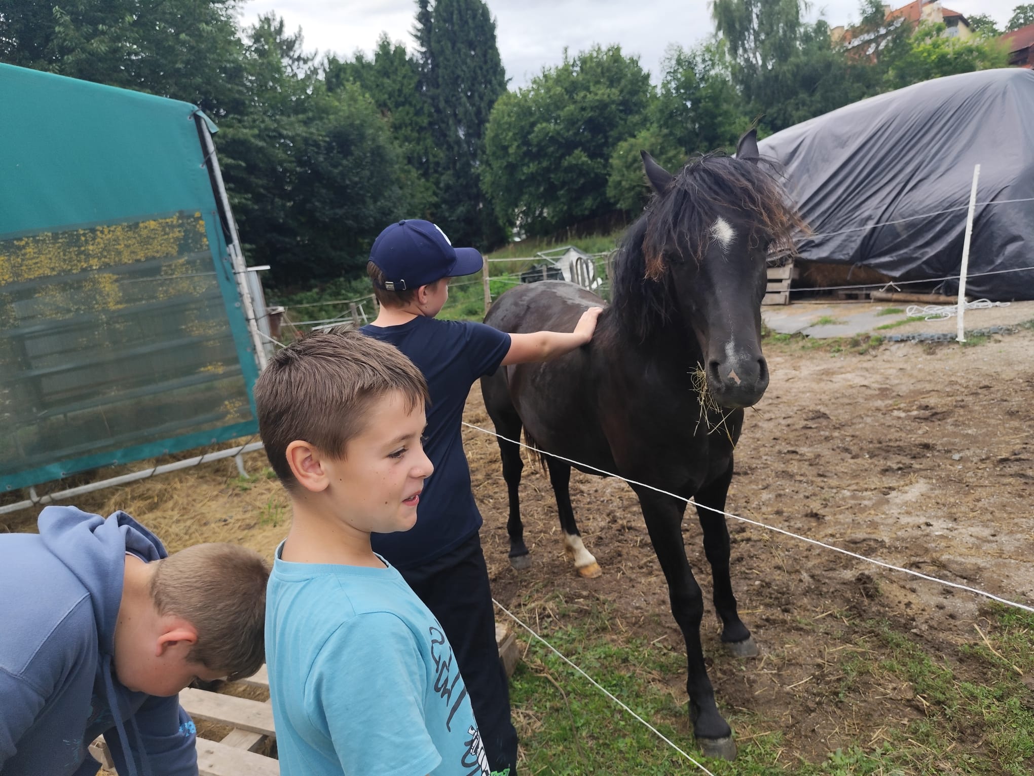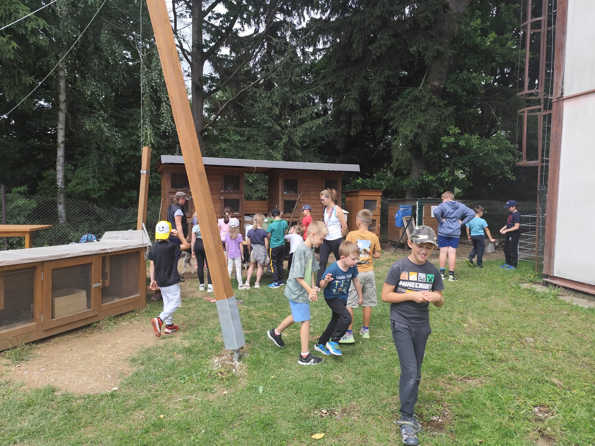 Ve čtvrtek se opět sportovalo a soutěžilo, ale odpoledne patřilo zvířatům zblízka. Děti navštívily králíky, znovu papoušky, a měly dokonce možnost projet se na koních. Během dne se podařilo zachránit i drobná, ale důležitá zvířata – motýla, včelu a mravence, která nesmí na arše chybět. Večer pak patřil klasickému táboráku – opékání buřtů, hra na kytaru a společné zpívání písniček sice ne pod hvězdami, jelikož nás vyhnal déšť, ale i tak si děti vytvořily nezapomenutelnou atmosféru. Tento večer byl výjimečný i tím, že děti zůstaly přes noc – přespávačka byla pro mnohé vrcholem týdne.