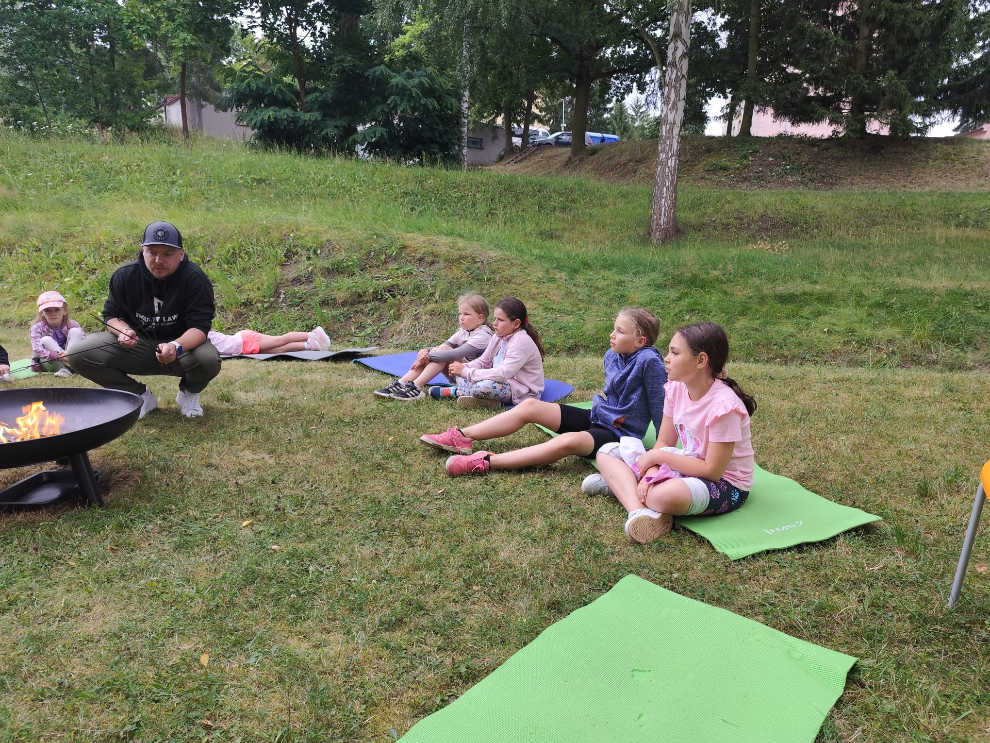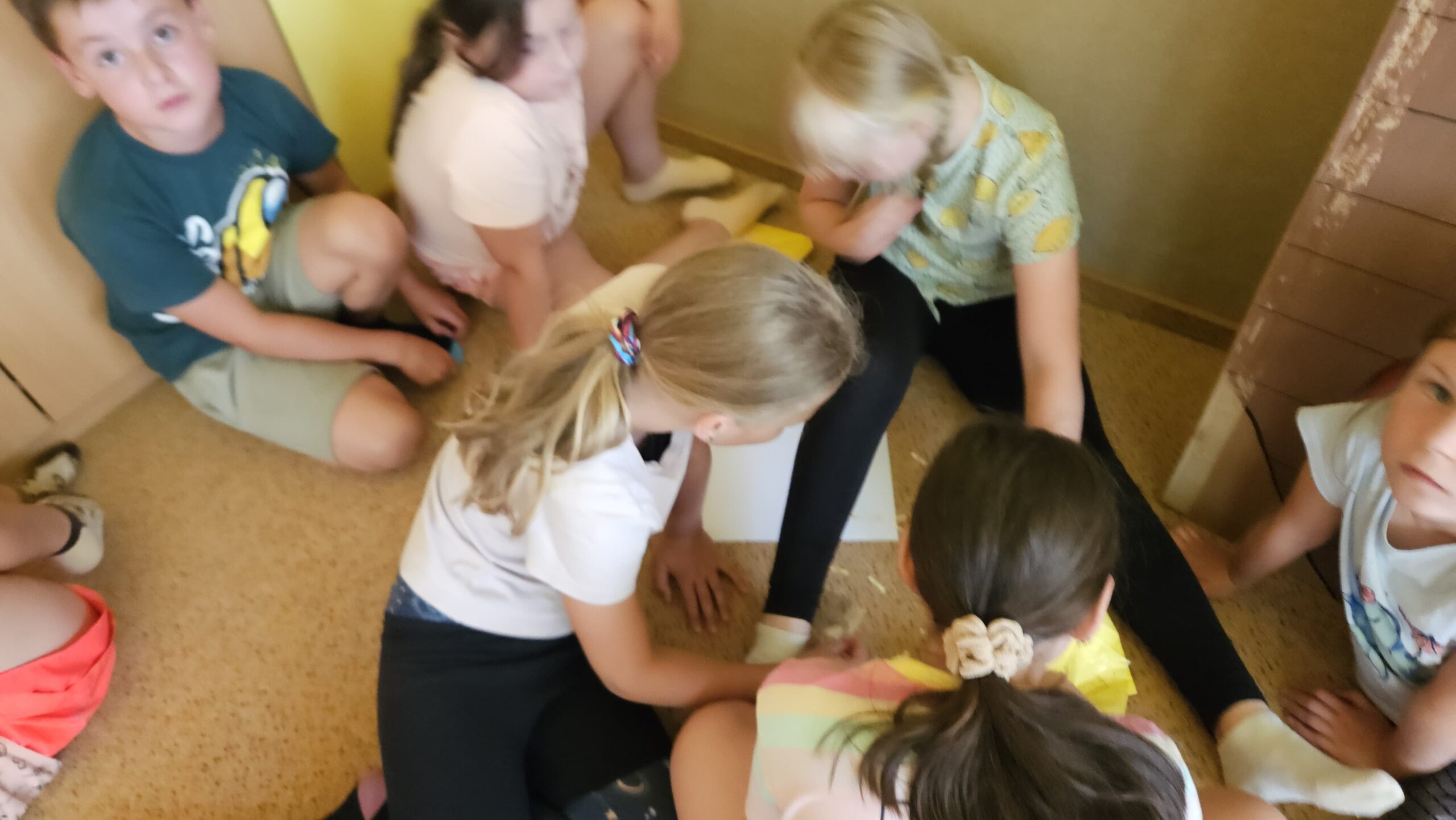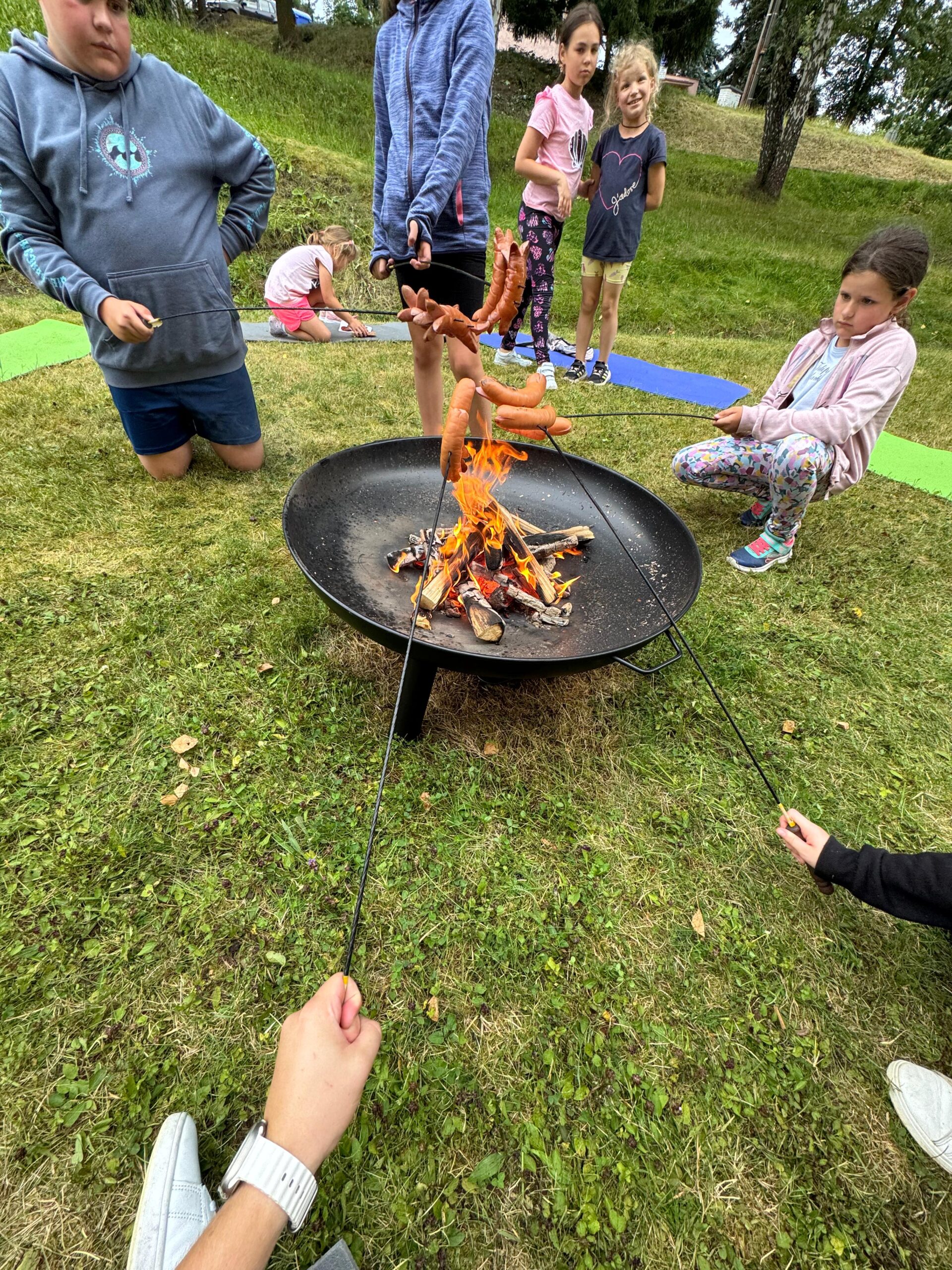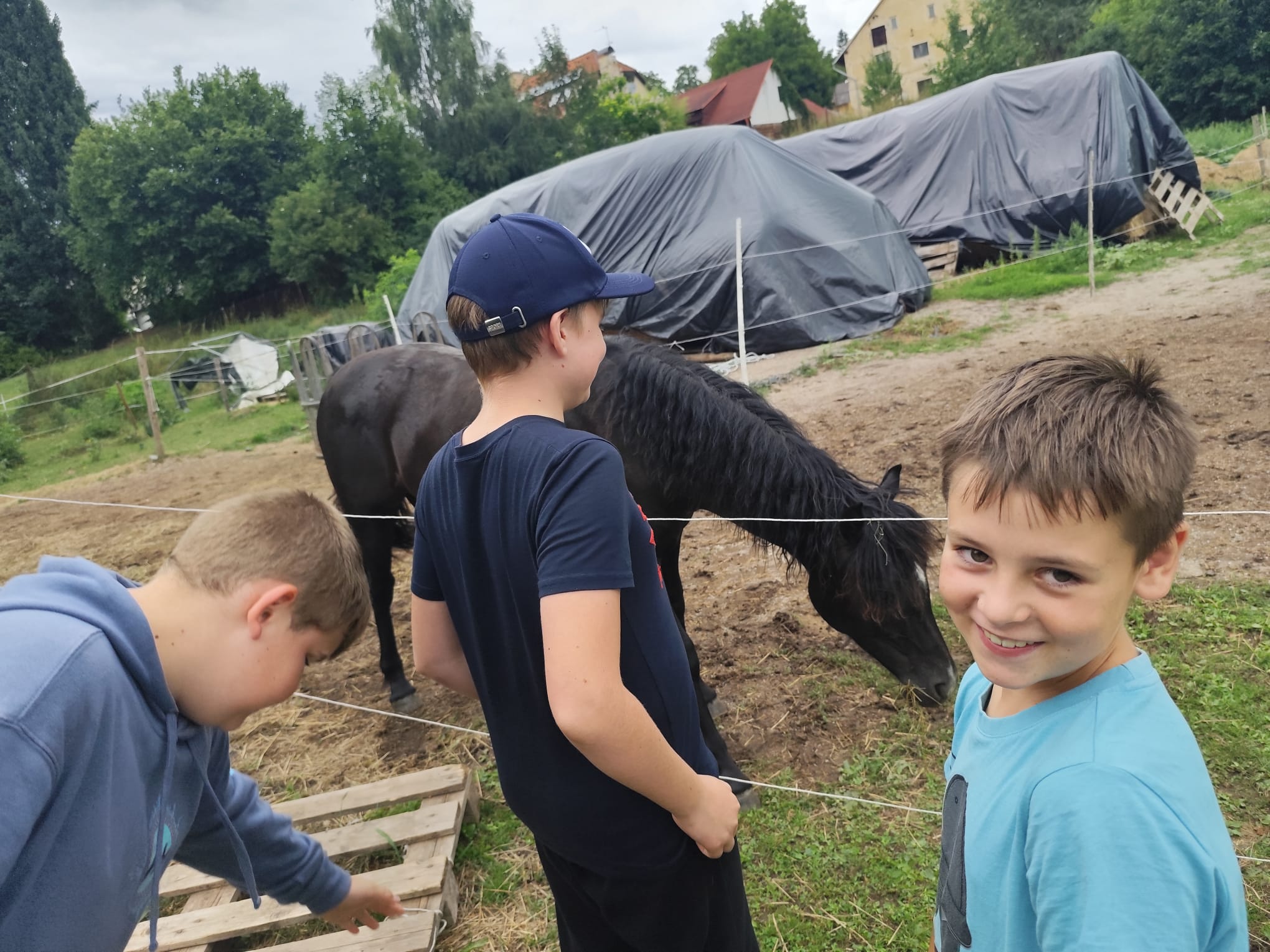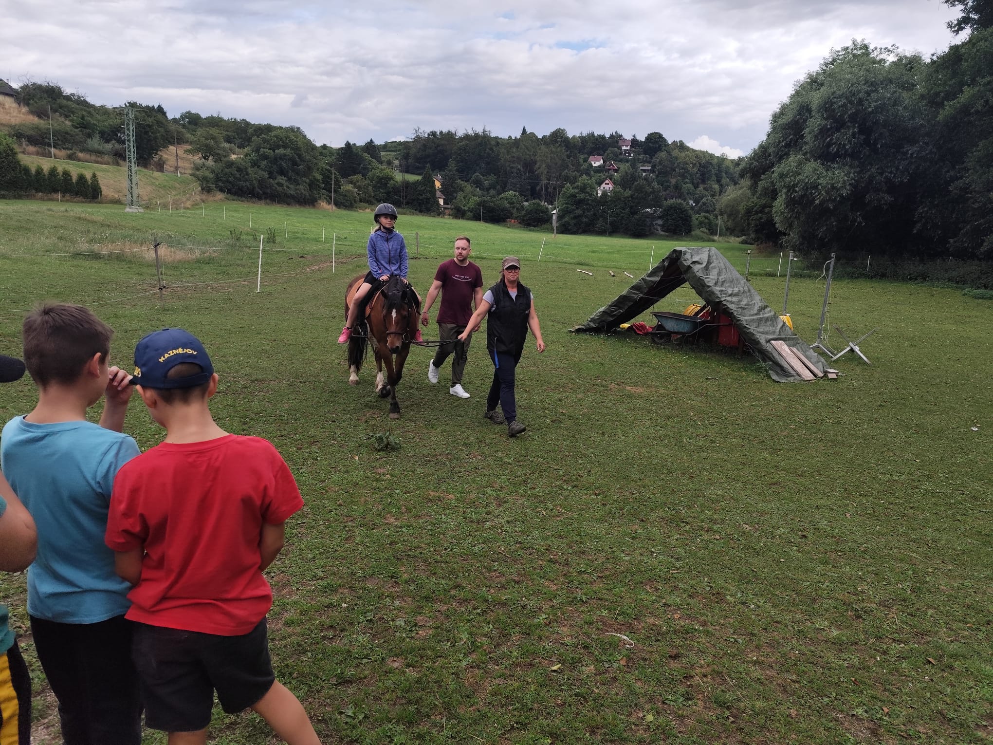 Ve čtvrtek se opět sportovalo a soutěžilo, ale odpoledne patřilo zvířatům zblízka. Děti navštívily králíky, znovu papoušky, a měly dokonce možnost projet se na koních. Během dne se podařilo zachránit i drobná, ale důležitá zvířata – motýla, včelu a mravence, která nesmí na arše chybět. Večer pak patřil klasickému táboráku – opékání buřtů, hra na kytaru a společné zpívání písniček sice ne pod hvězdami, jelikož nás vyhnal déšť, ale i tak si děti vytvořily nezapomenutelnou atmosféru. Tento večer byl výjimečný i tím, že děti zůstaly přes noc – přespávačka byla pro mnohé vrcholem týdne.